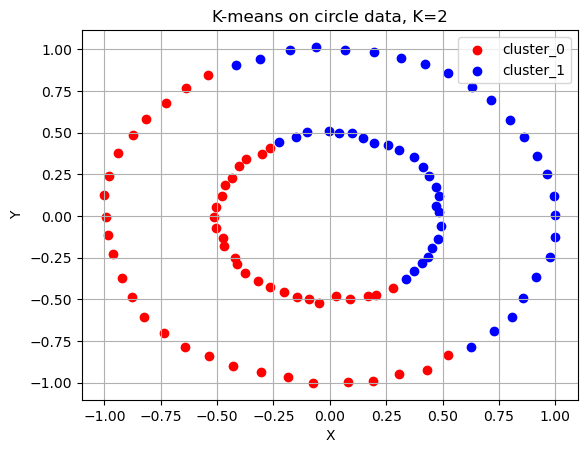 예시로, 다음의 경우에는 k-means가 잘 동작하지 않는다.
