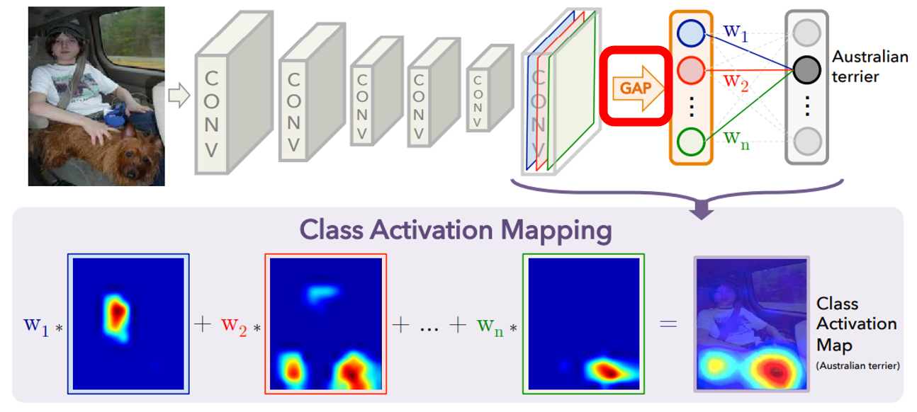 그러므로 GAP를 사용하면 CNN이 각 클래스에 어떤 특징을 활용해 분류를 수행하는지 확인할 수 있고, 시각화할 수 있다.