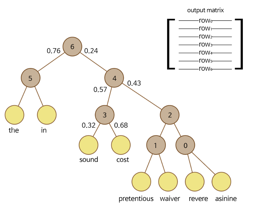 계층적 소프트맥스(Hierarchical Softmax)는 출력층을 이진 트리(Binary tree) 구조로 표현해 연산한다.
