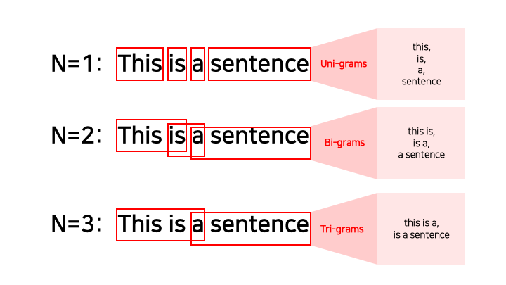 N=1 이면 Unigram, N=2 이면 Bigram, N=3 이면 Trigram, N>=4 이면 N-gram이라고 한다.
