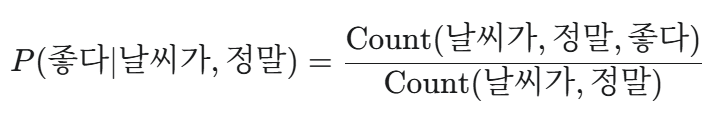 - P(좋다 | 날씨가, 정말)
