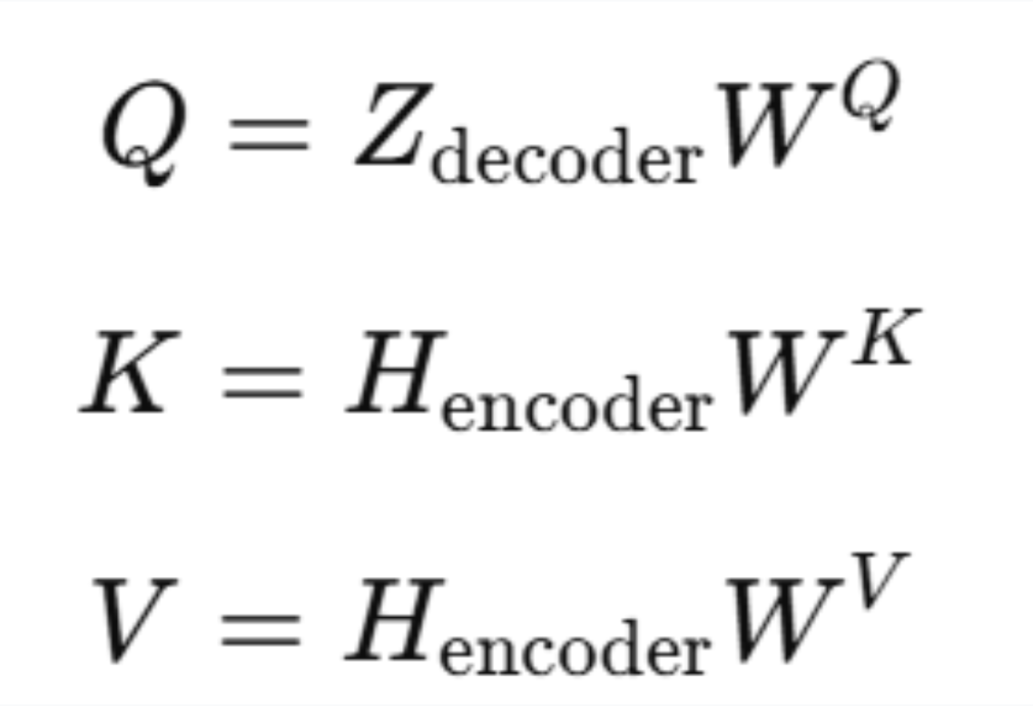 - K, V: 인코더의 출력(1.5. 단계에서 add & norm을 마친 행렬)에 W를 곱한 행렬