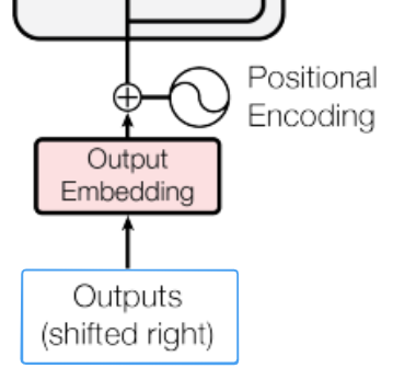 그런데 위의 그림을 보면 Outputs에 shifted right라고 표기되어 있는데, 이는 디코더의 inputs이 정답값을 오른쪽으로 한 칸 민 형태이기 때문에 그렇다.