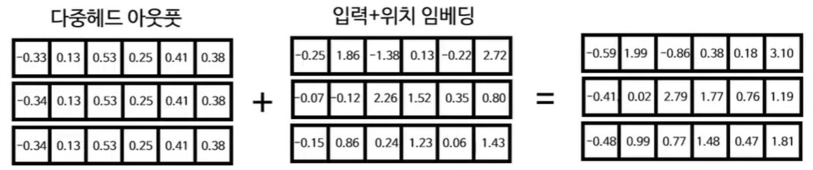 여기서는 이전 단계인 multi-head attention의 output과 positional embedding을 적용한 행렬을 더해준다.