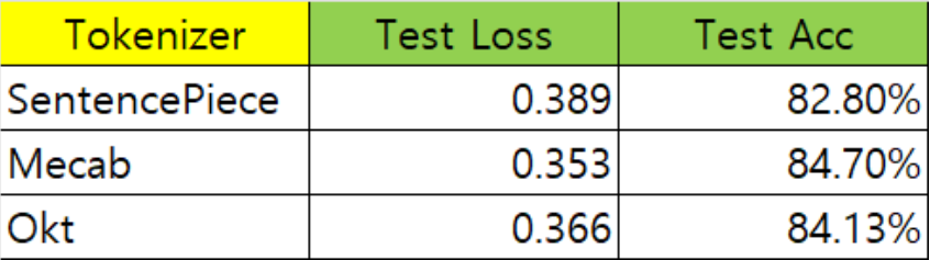 - SP를 사용한 LSTM의 성능이 Mecab, Okt를 사용한 LSTM의 성능보다 좋을 것이다.